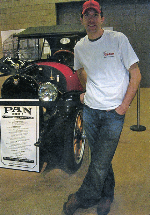 Automotive Hour listener, Aaron Fischer, from St. Cloud Minnesota, showing off his AGCO T-shirt. Aaron is standing beside a 1919 Pan Motor Company, Model A, originally built in St.Cloud.